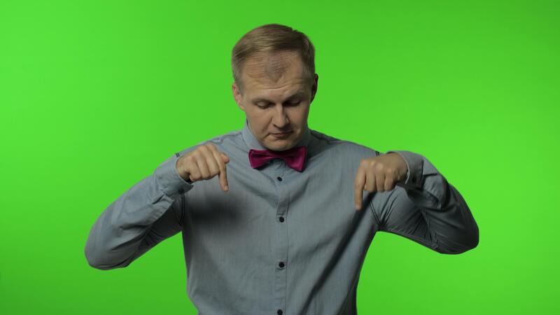 Man asking to subscribe, trying to control, pointing fingers down. Guy on chroma key background Pro Video