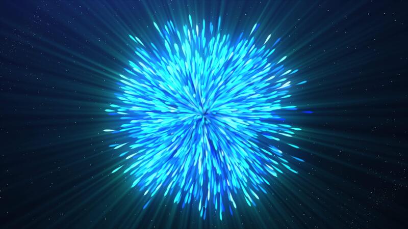 Colorful particles and strings spreading on a blue background. Motion. Moving rays into all the sides. Pro Video