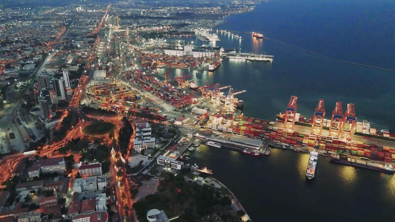 Drone films seaport at night highlighting illuminated port facilities Port cranes loading and unloading cargo scene captures bustling port activities under night sky with cranes operating efficiently Pro Video