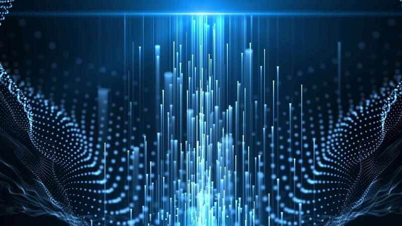 Abstract digital futuristic background with particle waves and glowing neon particles flying upward. movement of a stream of glowing bright lines of particles. Visualization of connection and big data Pro Video