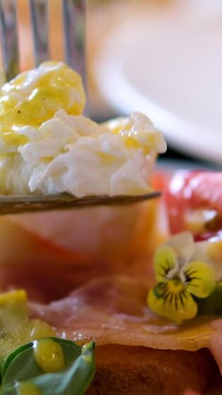Eggs Benedict on toasted muffins with ham and sauce Prick microgreens with a fork and poached egg Benedict. Egg benedict with hollandaise sauce and smoked salmon on toast Pro Video