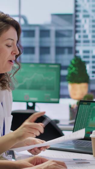 Vertical Applicant gives his CV to human resources staff to begin the job interview, reviewing the qualifications and work experience from the application form. Discussing job roles available. Camera A. Pro Video