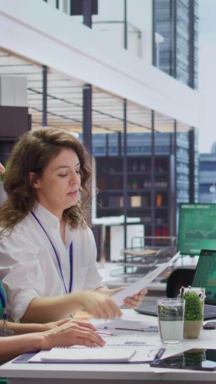 Vertical Applicant gives his CV to human resources staff to begin the job interview, reviewing the qualifications and work experience from the application form. Discussing job roles available. Camera B. Pro Video