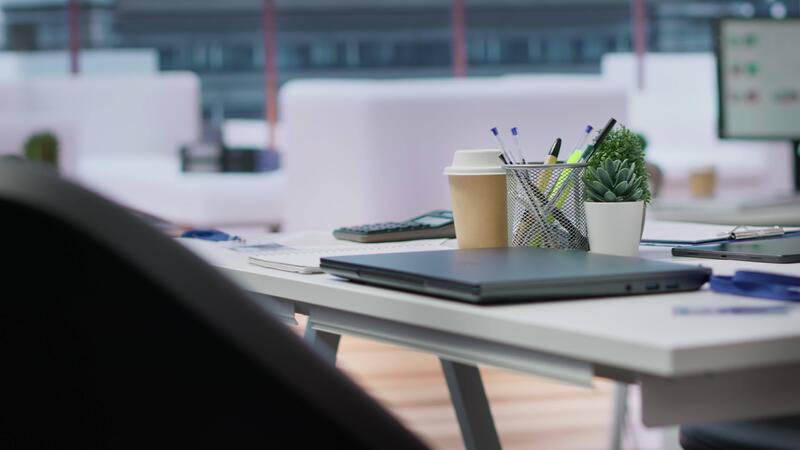 Empty corporate high end office prepared for job interviews and recruitment process, a computer displaying data and infographics. Business career development recruiting. Pro Video