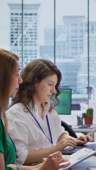 Vertical Job candidate sits across from interviewers team in high end office, presenting qualifications and discussing various job opportunities or career paths within the company. Employment. Camera B. Pro Video