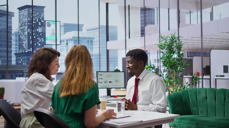 Job seeker at interview writing his name on application form, registering in the company database. Applicant filling in documents while he discusses career development plans. Camera B. Pro Video