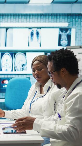 Vertical Healthcare experts in a meeting discussing treatment protocols and improvements. Doctors and nurses evaluating diagnostic results in a private clinic to enhance medical services quality. Camera B. Pro Video