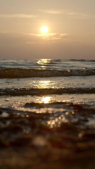Close-up of small waves on background of sunset. Creative. Rolling small waves on seashore with sunset horizon. Waves on background of sea sunset Pro Video