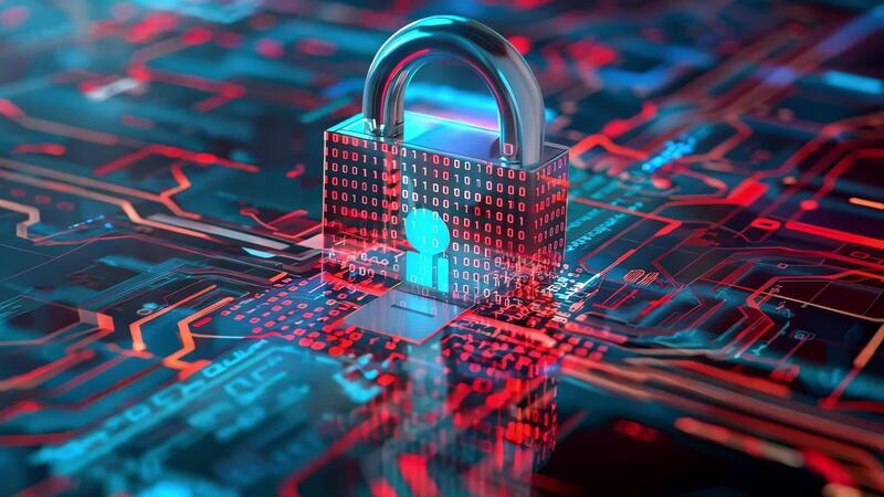 A digital secure lock symbolizing advanced cybersecurity on a vibrant circuit board background, representing data protection. Free Video
