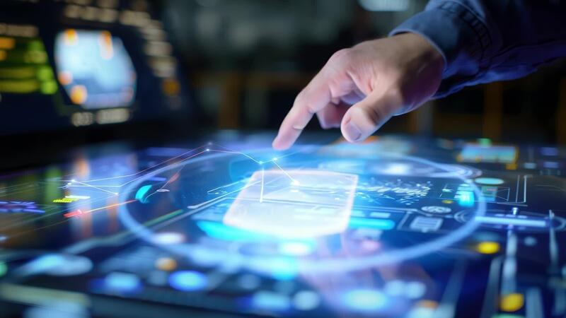 A close-up of a hand interacting with a futuristic touchscreen displaying digital interfaces and holographic elements. Free Video