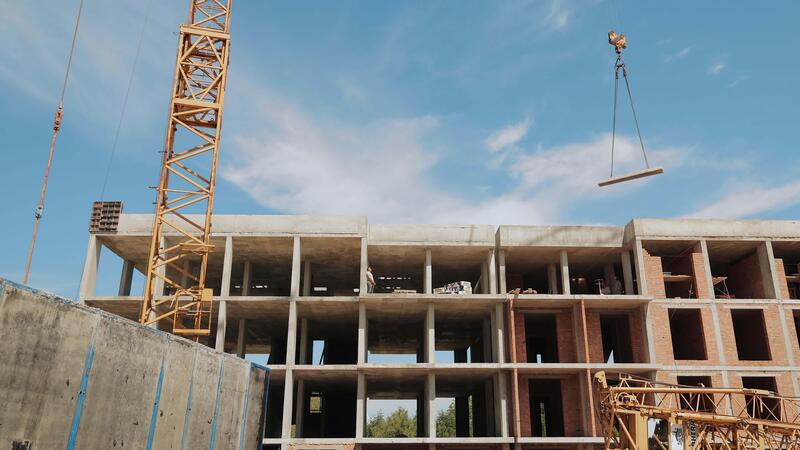 Crane Lifting Concrete Slab at Building Construction Site. A crane is in the process of lifting a concrete slab on a large construction site, with a partially completed building in the background. Pro Video