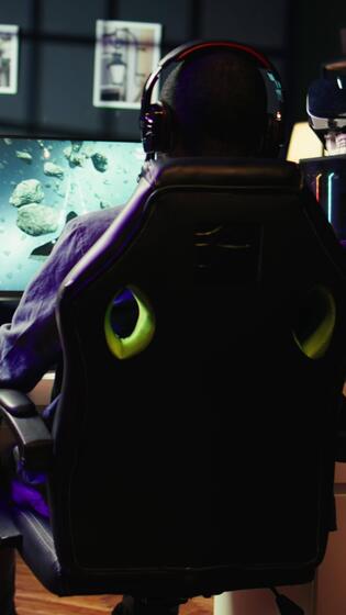 Vertical Player at home shooting asteroids in spaceship flying singleplayer game with overlay HUD showing health levels on monitor. Close up of person navigating universe in simulation game on PC Pro Video
