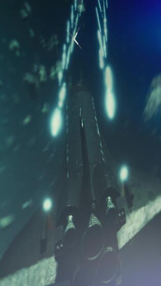 Vertical Man shoots asteroids in spaceship flying singleplayer game on gaming PC with overlay HUD showing health, fuel bars. Gamer navigating universe in simulation game, camera B Pro Video