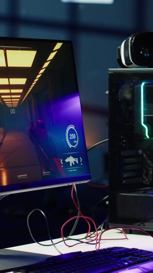 Vertical FPS videogame left open on PC screen in empty neon illuminated apartment living room. Shooter game on computer desktop display in RGB lit home late at night with no people in Pro Video