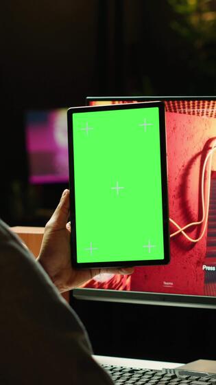 Vertical Man watching videos on green screen tablet while playing first person shooter videogame at home. Gamer looking at chroma key device display while enjoying online game on PC Pro Video