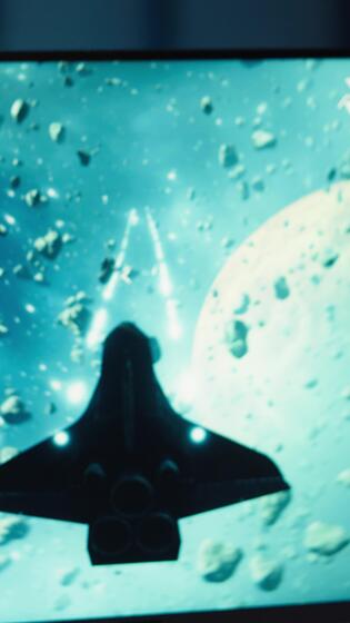 Vertical Man at home shooting asteroids in spaceship flying singleplayer game with overlay HUD showing health, fuel, ammo bars and minimap. Gamer navigating universe in simulation game, close up, camera A Pro Video