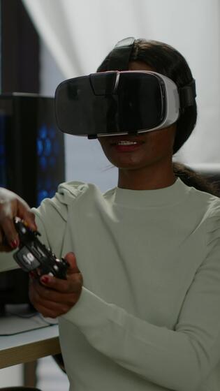 Vertical . Winner player holding joystick playing videogame in gaming room using virtual reality. Professional pro gamer streaming online videogames with new graphics on powerful computer using modern equipment. Pro Video