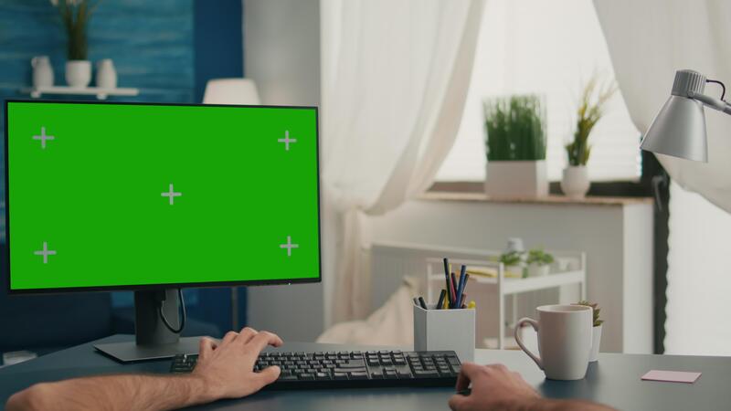 Pov of man hands sitting on office desk using computer with mock up green screen chroma key working Pro Video