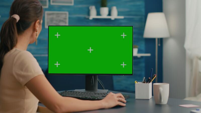 Woman looking at computer with green screen mock up chroma key display working at business commerce, Caucasian female using powerful isolated pc while collegue reading in background Pro Video