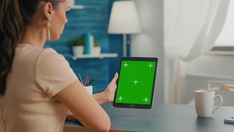 Freelancer woman working on communication ideas for online project using tablet computer with mock up green screen chroma key display. Office room in equipped with powerful isolated device Pro Video