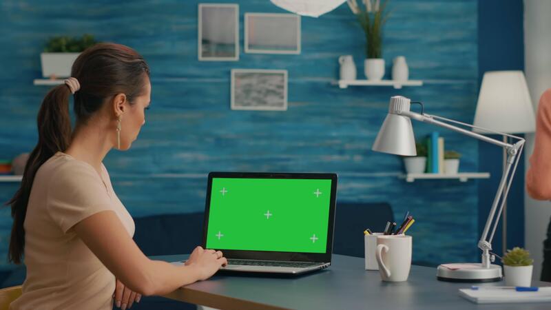 Freelancer using computer with mock up green screen chroma key for business company standing on desk table. Woman using isolated home office pc working at commerce project in home office Pro Video
