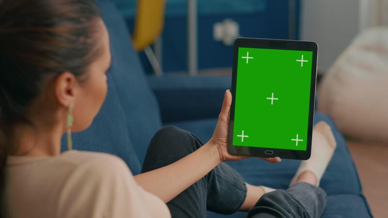 Caucasian female lying on sofa having online meeting on tablet computer with mock up green screen chroma key display. Woman using isolated touchscreen device for social networks browsing Pro Video