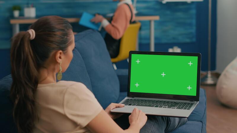 Freelancer sitting on couch working on business ideas using laptop computer with mock up green screen chroma key display. Caucasian female searching the network use isolated pc Pro Video