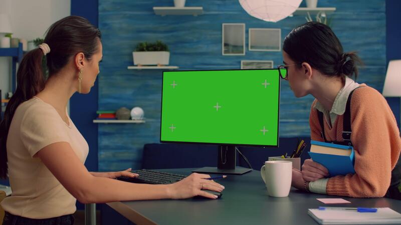 Teammates browsing on internet for commerce advertising using powerful computer with mock up green screen chroma key display. Collegues working on isolated pc sittings at desk table in office studio Pro Video