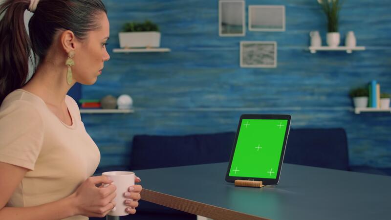 Freelancer looking at tablet computer display with mock up green screen chroma key while searching ideas on network. Caucasian female sitting on desk in office studio using powerful isolated gadget Pro Video