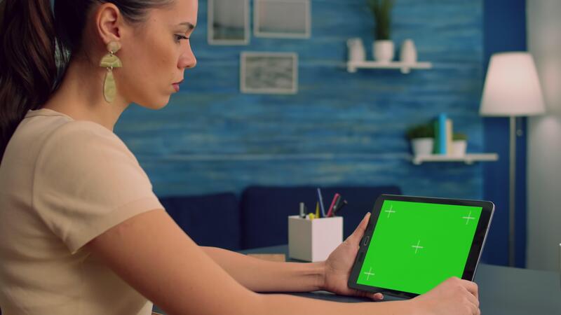 Woman working at office desk using mock up green screen tablet computer in landscape mode, watching online content. Freelancer looking at template chroma key isolated device using technology internet Pro Video