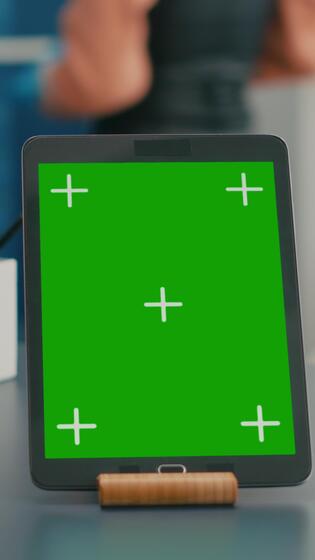 Vertical . Close up of tablet computer with mock up green screen chroma key display it is used for office work. Freelancer woman working on communication project using isolayed gadget sitting on desk Pro Video