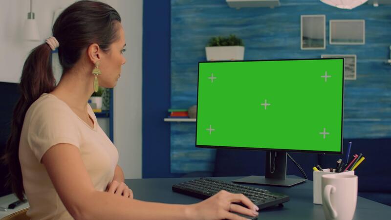 Freelancer sitting at desk table and browsing on network for commerce business using computer with mock up green screen chroma key. Caucasian female working with isolated pc in office home apartment Pro Video