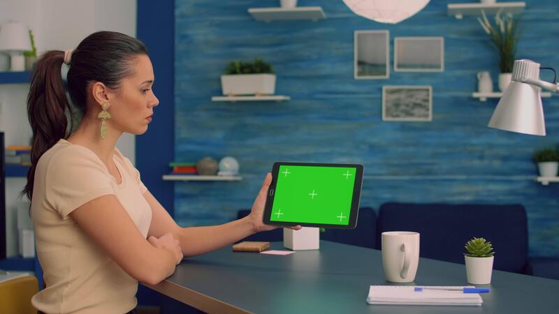 Woman watching online videos on tablet computer with mock up green screen display while sitting at office desk. Freelancer looking at template chroma key isolated device using technology internet Pro Video