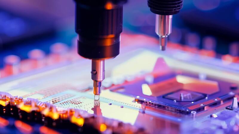 Microchip production printing processor CPU component AI memory storage microelectronics assembly semiconductor technology industry manufacturing computer circuit board equipment Pro Video