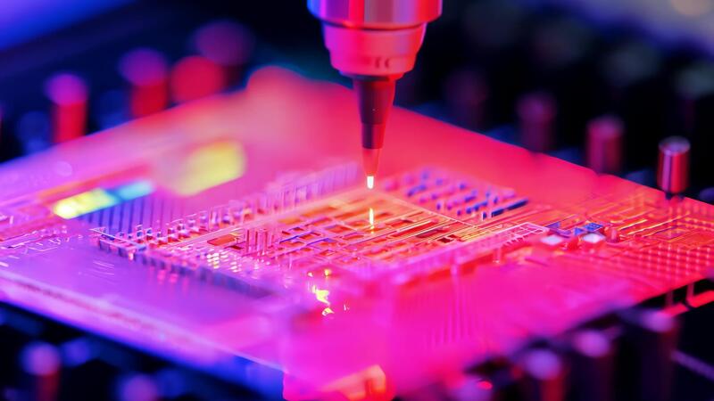 Microchip production printing processor CPU component AI memory storage microelectronics assembly semiconductor technology industry manufacturing computer circuit board equipment Pro Video