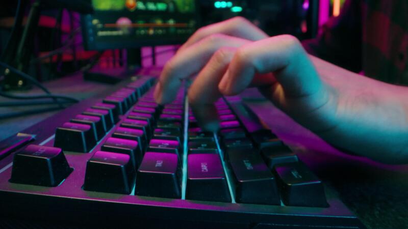 Close up hands man typing keyboard computer pc play game programmer neon cyberspace hacking network competition electronic fingers technology connection social media internet coding chatting texting Pro Video