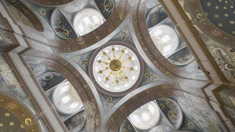 High ceiling. Action. A huge temple with a ceiling decorated with patterns, which is removed from below. Pro Video