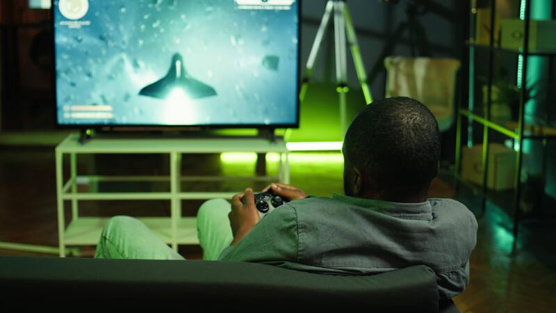 Man playing SF videogames on gigantic smart TV, relaxing after long day at work. Competitive gamer having fun on gaming console in apartment, piloting spaceship using controller, camera B Pro Video