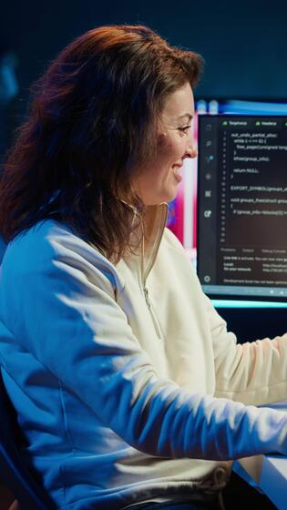 Vertical Happy admin in home office satisfied after futureproofing company network from downtimes and unexpected system failures. Smiling IT expert pleased after managing to increase data security, camera A Pro Video