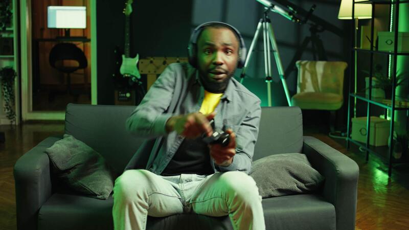 Enthusiastic gamer on couch using controller and headphones to play videogame in neon lit apartment. Player in RGB illuminated living room using high tech gaming console joystick, camera B Pro Video