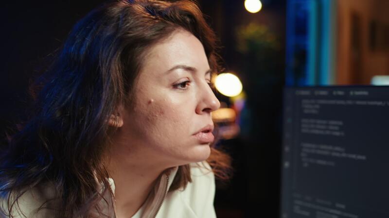 Worried cybersecurity expert pouting after finding many security vulnerabilities, scared of malware infections. Anxious developer distressed by cyber attacks on computer systems, camera B Pro Video