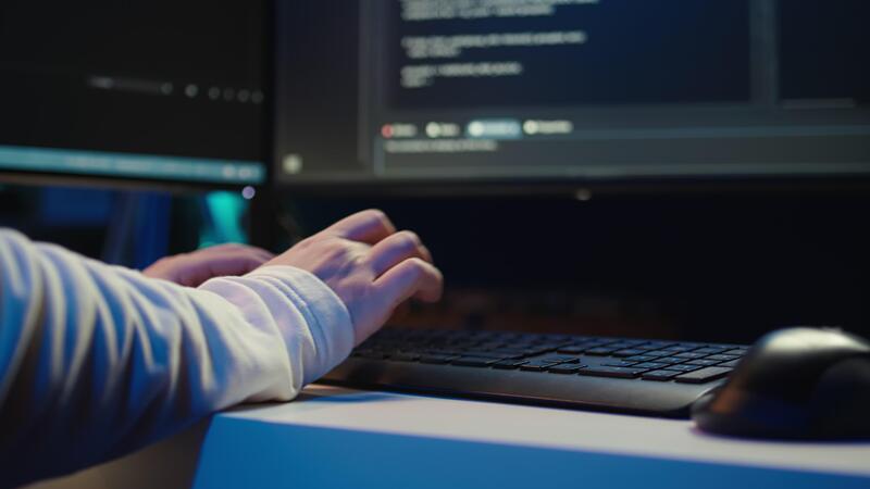 Technician doing software quality assurance, reading source code on PC before implementing it. IT admin inspecting coding on computer, looking to fix potential issues, camera B close up Pro Video