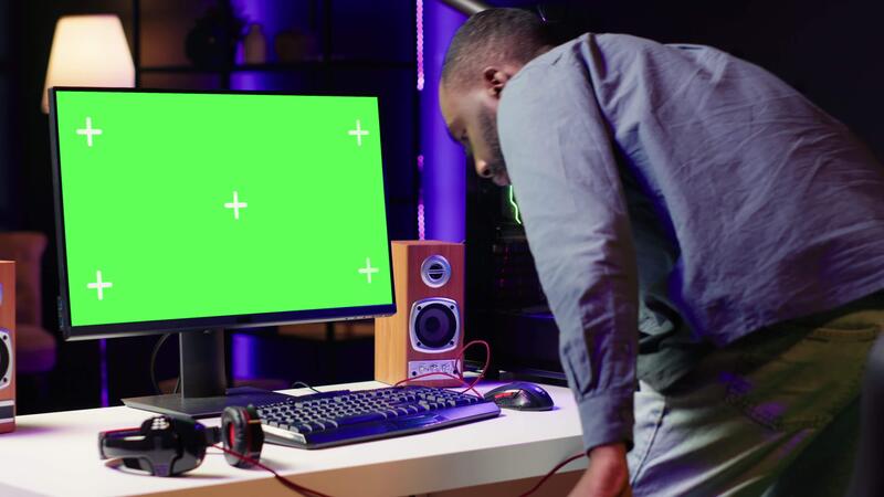 Gamer using keyboard and mouse to play videogame on gaming PC isolated screen monitor. Man in apartment at night using high tech computer peripherals to defeat foes on mockup display Pro Video