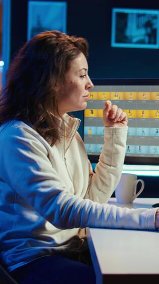 Vertical Photographer using professional photo editing tools on PC display. Photo editor utilizing high tech photographs retouching application to make adjustments using computer screen, camera B Pro Video