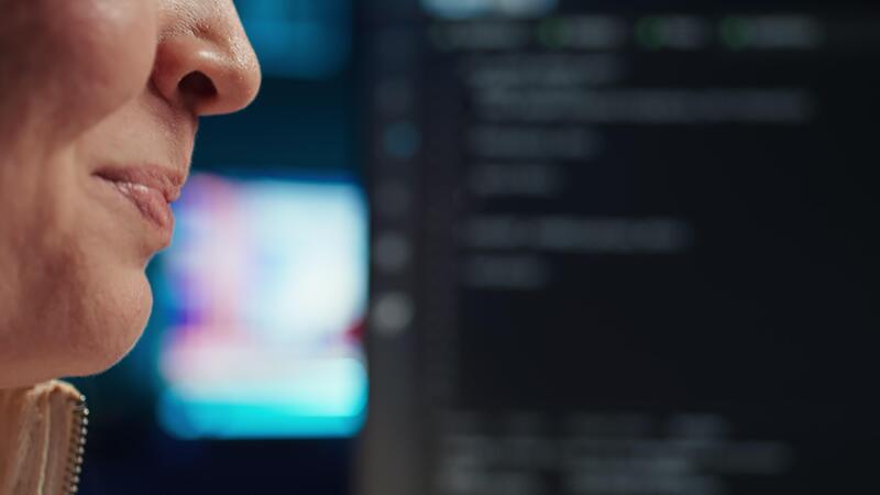 Extreme closer up shot of happy computer engineer satisfied after futureproofing company network from system failures. Smiling IT worker pleased after managing to increase data security, camera B Pro Video
