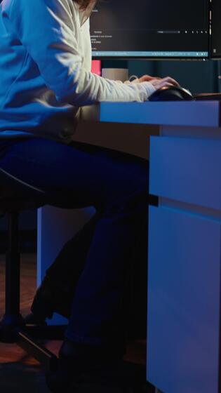 Vertical Programmer stretches body limbs after securing company servers from virus attacks all day. Fatigued IT remote employee relaxing tense muscles at desk after building firewalls protecting data, camera B Pro Video