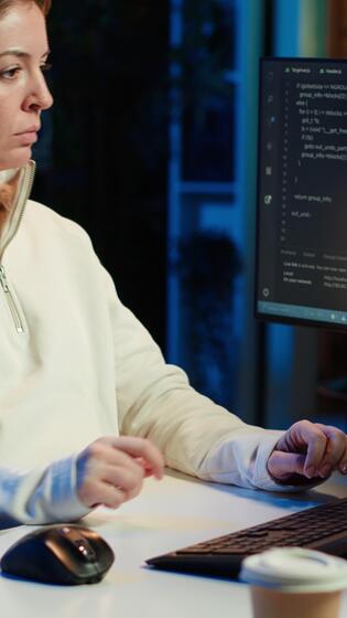 Vertical Woman listening music while doing software quality assurance, reading source code on computer screen. Developer wearing headphones enjoying podcasts and inspecting coding on desktop PC, camera A Pro Video