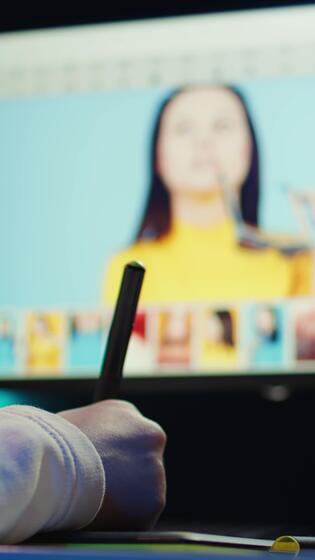 Vertical Photo editor using graphic tablet to retouch photographs with editing software on, zooming in to find spots that need correcting. Photographer in creative workplace adjusting images, camera B Pro Video