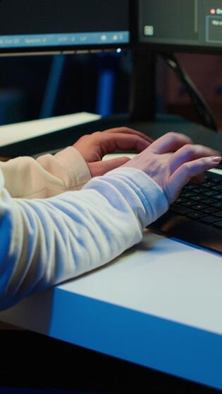 Vertical Teleworking computer technician typing on keyboard, implementing security measures to protect company systems and data, close up. Remote IT employee at home debugging code for software, camera A Pro Video