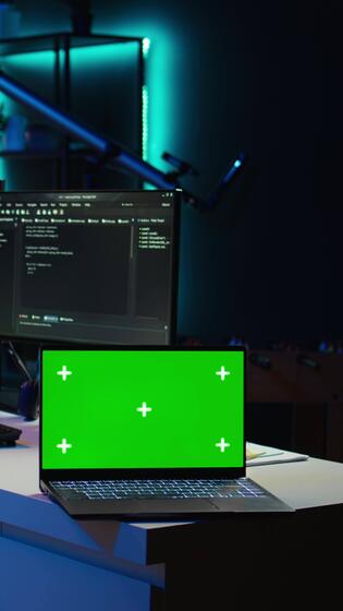 Vertical Admin using green screen laptop to implement security measures, protecting company systems and data. IT worker testing and debugging code for software applications on chroma key notebook, camera B Pro Video